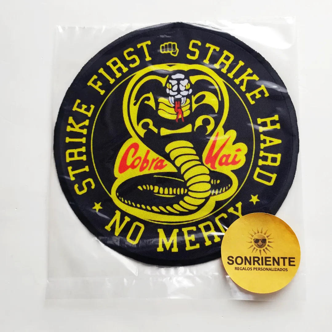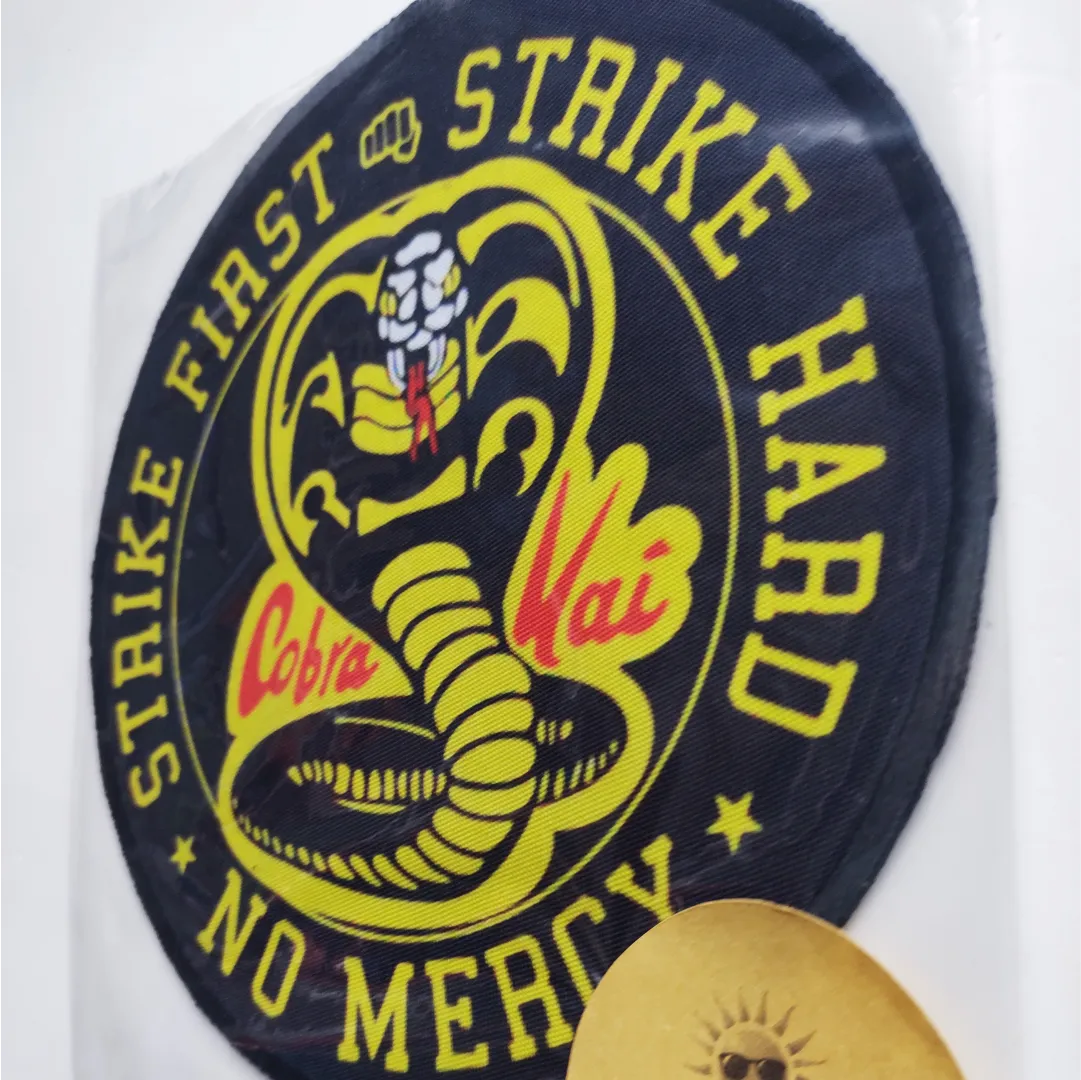 Espaldera sublimada con diseño de la banda Cobra Kai ideal para chaquetas de mezclilla, disfraces o cosplays.