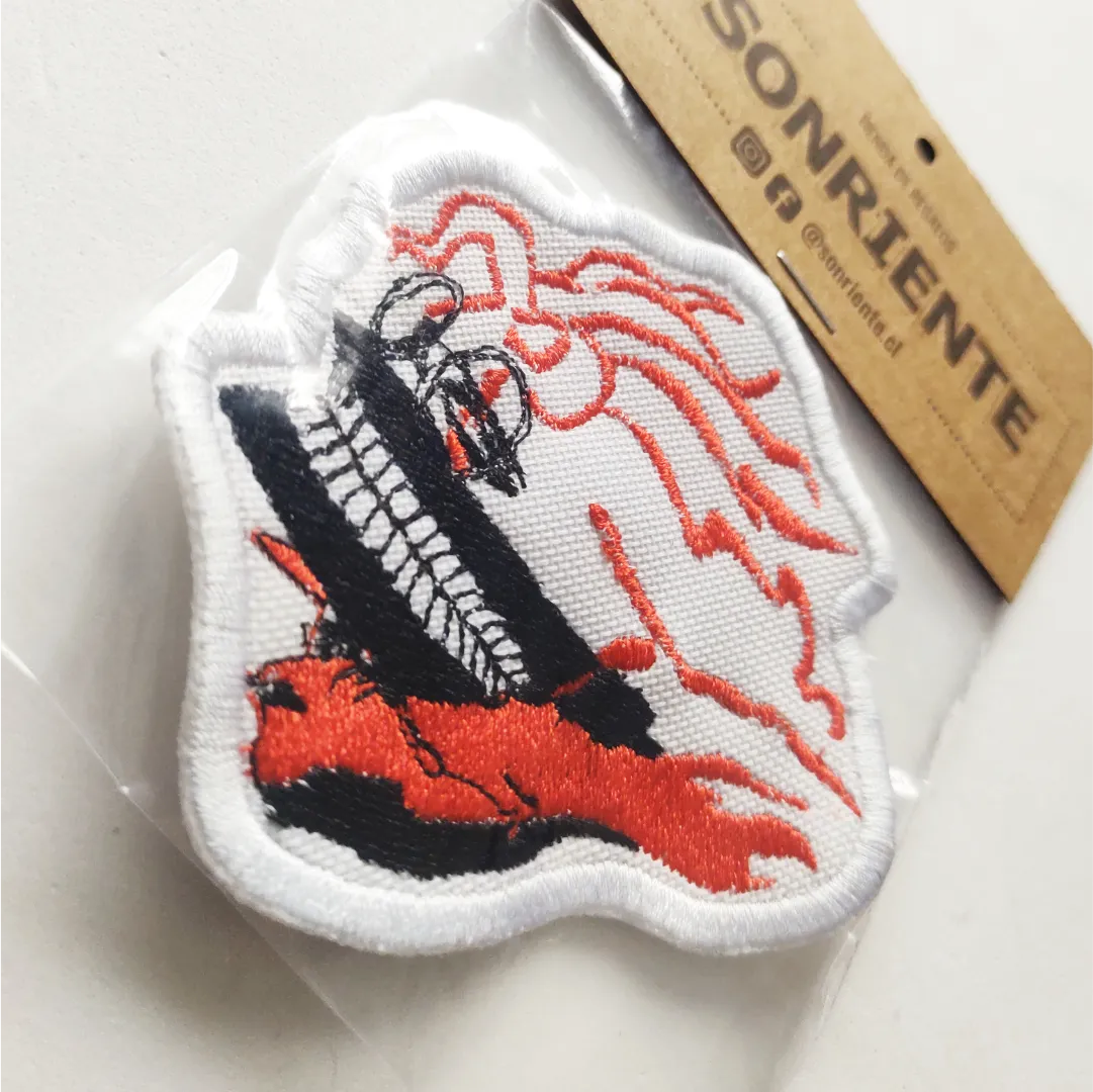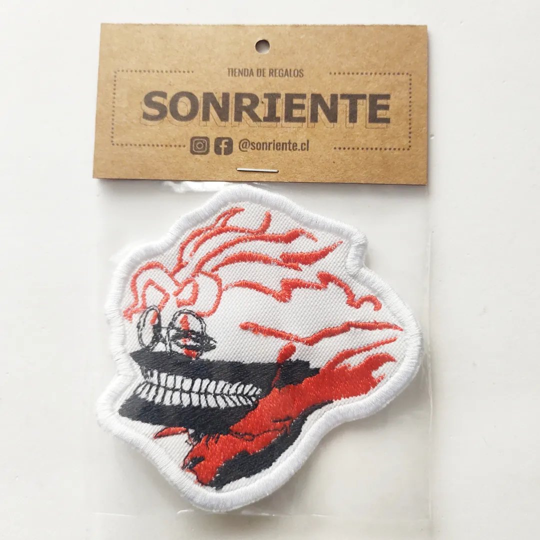 Parche de Okarun del anime Dan da dan de un tamaño de 9x9 cm bordado sobre tela blanca e hilo rojo, blanco y negro, ideal para disfraces.mochilas o cosplays.