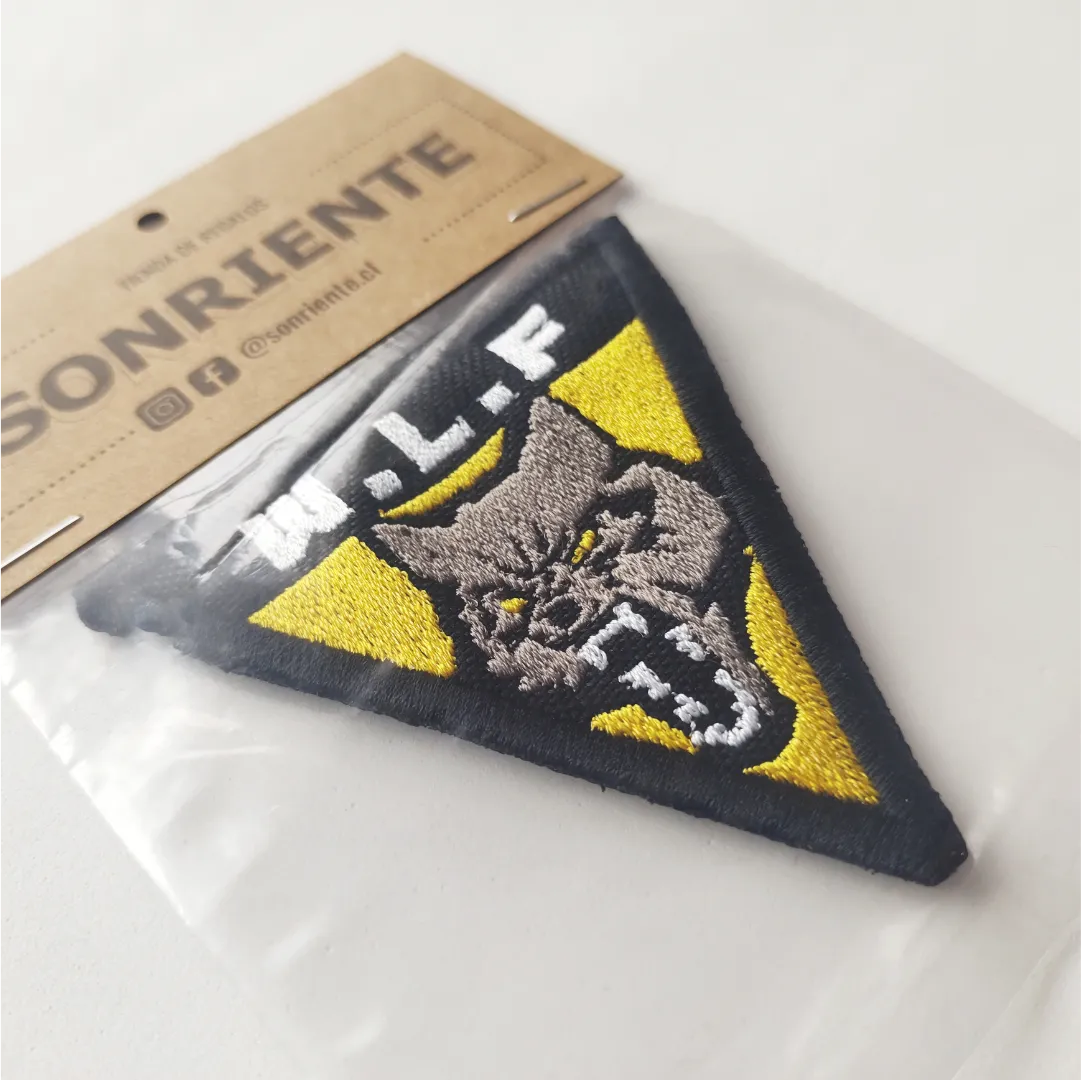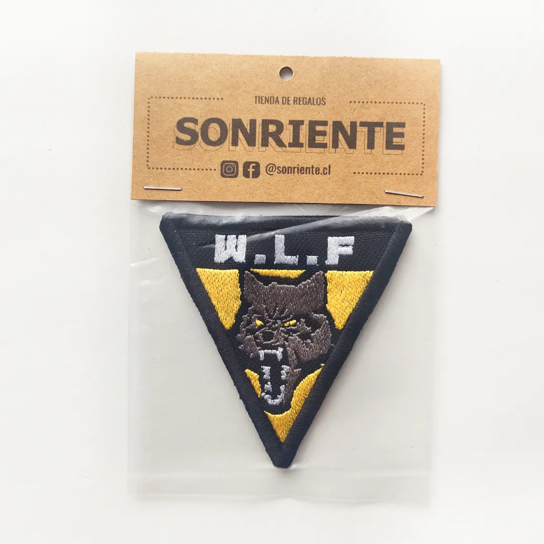 Parche de WLF de la serie The Last Of Us de un tamaño de 8x8 cm bordado sobre tela negra e hilo blanco, amarillo y gris, ideal para disfraces o cosplays.